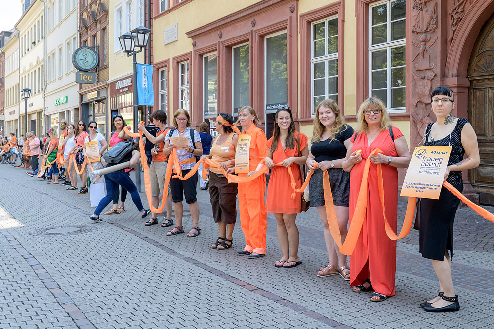 13.6.2018 mo-j Es war ein erhebendes Gefühl am Samstagmittag, 9.6. 13 Uhr in der Mitte der Hauptstraße Heidelberg: Mensch an Mensch solidarisch gegen sexualisierte Gewalt an Frauen und Mädchen und für ein selbstbestimmtes Leben. Viele waren gekommen mit orangefarbenen Accessoires und Trillerpfeifen oder ganz in Orange gekleidet, der Logofarbe des Frauennotrufs gegen sexuelle Gewalt an Frauen und Mädchen e.V. in Heidelberg e.V..