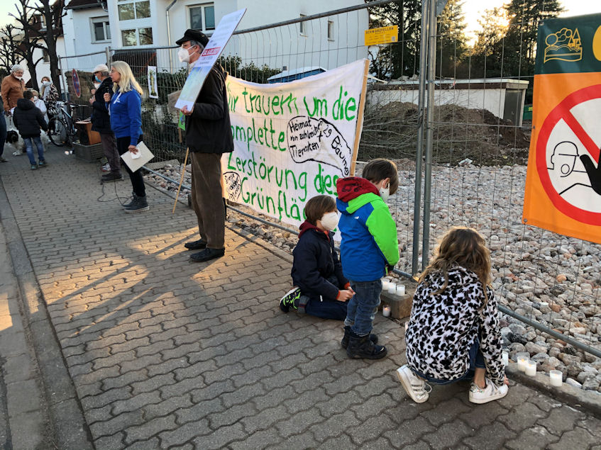 15.3.2021 Am Wieblinger Dammweg 2c versammelten sich etwa 40 Menschen zu einer Mahnwache für verlorene Natur. Menschen trugen Kerzen an das Grundstück. Die Initiative „Für Wieblingen – für Tier, Mensch und Klima“ hatte über 1.100 Unterschriften gesammelt für den Erhalt dieser parkähnlichen Anlage in Wieblingen-West. Dort wurde auf rund 2000 m² die gesamte Vegetation abgeräumt. Die biologisch hochwertige Fläche war ein wichtiger Lebensraum für Tiere und Menschen. [bilder: kreckel-arslan]