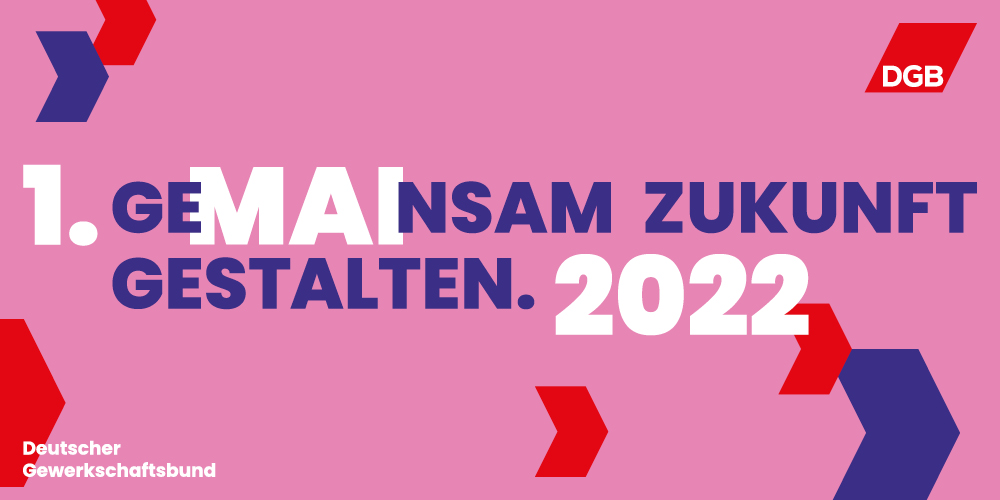 Der Tag der Arbeit 2022 steht unter dem Motto „GeMAInsam Zukunft gestalten“.(link is external) Denn wir als Gewerkschaften stehen für ein solidarisches Miteinander, auch in unruhigen Zeiten. Gemeinsam wollen wir in diesem Jahr daher wieder auf die Straße gehen und am Tag der Arbeit ein sichtbares Zeichen für eine gerechte Zukunft setzen.