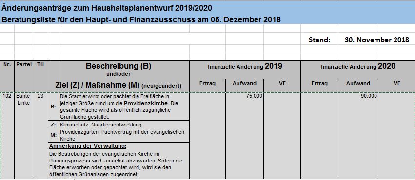22.12.2018 awl In der Beratung des Haushaltes 2019/20 im Gemeinderat, hatte die Bunte Linke einen Antrag eingebracht, einen Betrag einzustellen, der den Abschluss eines Erbpachtvertrages mit der Providenzgemeinde ermöglicht. Dieser Antrag wurde in der interfraktionellen Beratung in den gemeinsamen Änderungsantrag aufgenommen und im Gemeinderat beschlossen. Die eingestellten 90 000 Euro/Jahr entsprechen dem Betrag, für den die Kirche bis zum 15.1.2019 eine Zusage von Seiten der Stadt erwartet hatte. Dafür wäre ein regulärer Beschluss des Gemeinderates zu spät gekommen. In der Sache kann der Gemeinderat erst im neuen Jahr entscheiden.