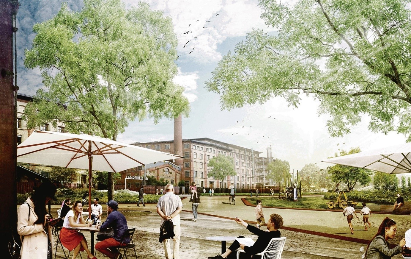 1. Spielplatz an der ÖPNV-Straße, Durchlässigkeit zum Landfried-Gelände? Die Stadt hat im Vorfeld des Bürgerentscheids Visualisierungen erstellt, u.a. wie ein Park mit Café und Spielplatz auf dem Gelände des Bahn-Bus-Betriebshof aussehen könnte, sehr ansprechend, leider gefaked.