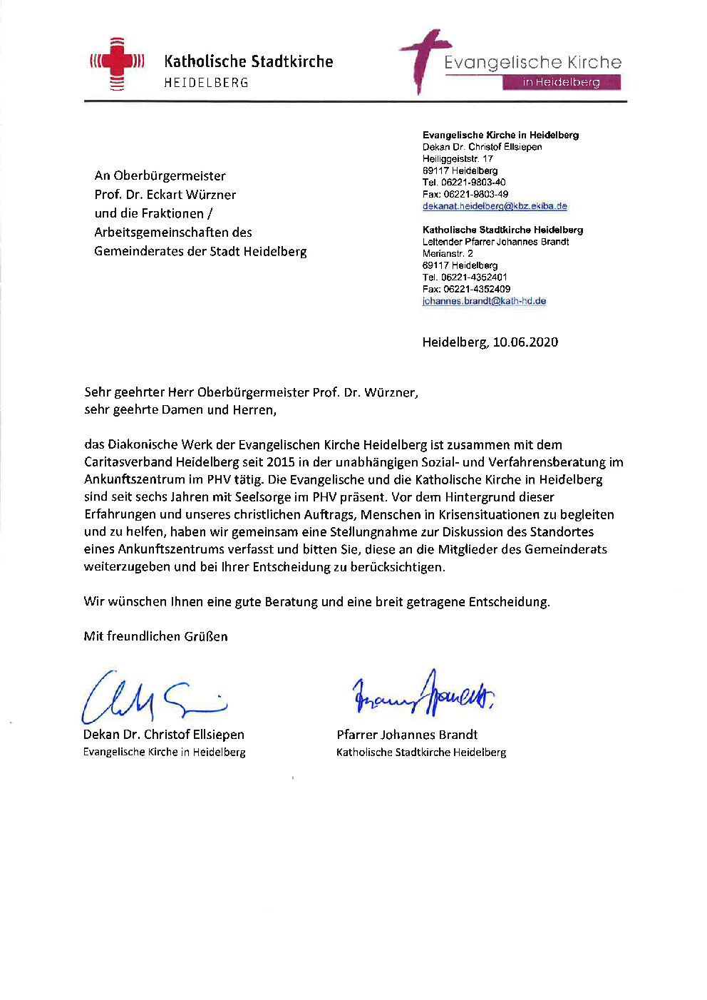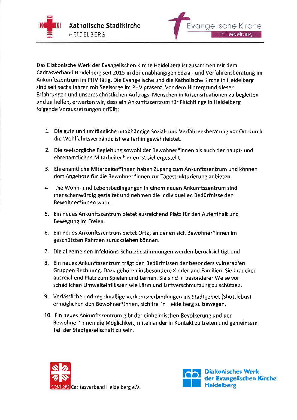 10.6.2020 Vor der anstehenden Entscheidung des Gemeinderates für den Standort des Ankunftszentrums formulieren die beiden Kirchen Anforderungen, die sie an ein Ankunftszentrum stellen: Gute und umfängliche Sozialberatung, menschenwürdige Wohn- und Lebensbedingungen, Zugang für ehrenamtliche Mitarbeiter, ausreichend Platz für Aufenthalt und Bewegung im Freien, ...