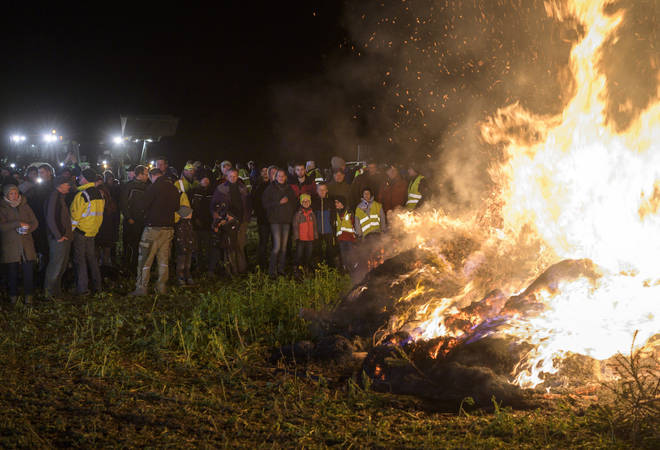 Wer gestern auf der Bundesstraße 535 unterwegs war, konnte schon von Weitem die Flammen und vor allem die Traktorenscheinwerfer sehen. Und genau das war auch der Plan der gut 70 Landwirte aus Kirchheim und Umgebung, die sich unter dem Motto "Der Gäulschlag brennt" mit etwa 50 Traktoren auf dem Gewann südlich von Patrick Henry Village (PHV) um ein großes Mahnfeuer versammelt hatten.