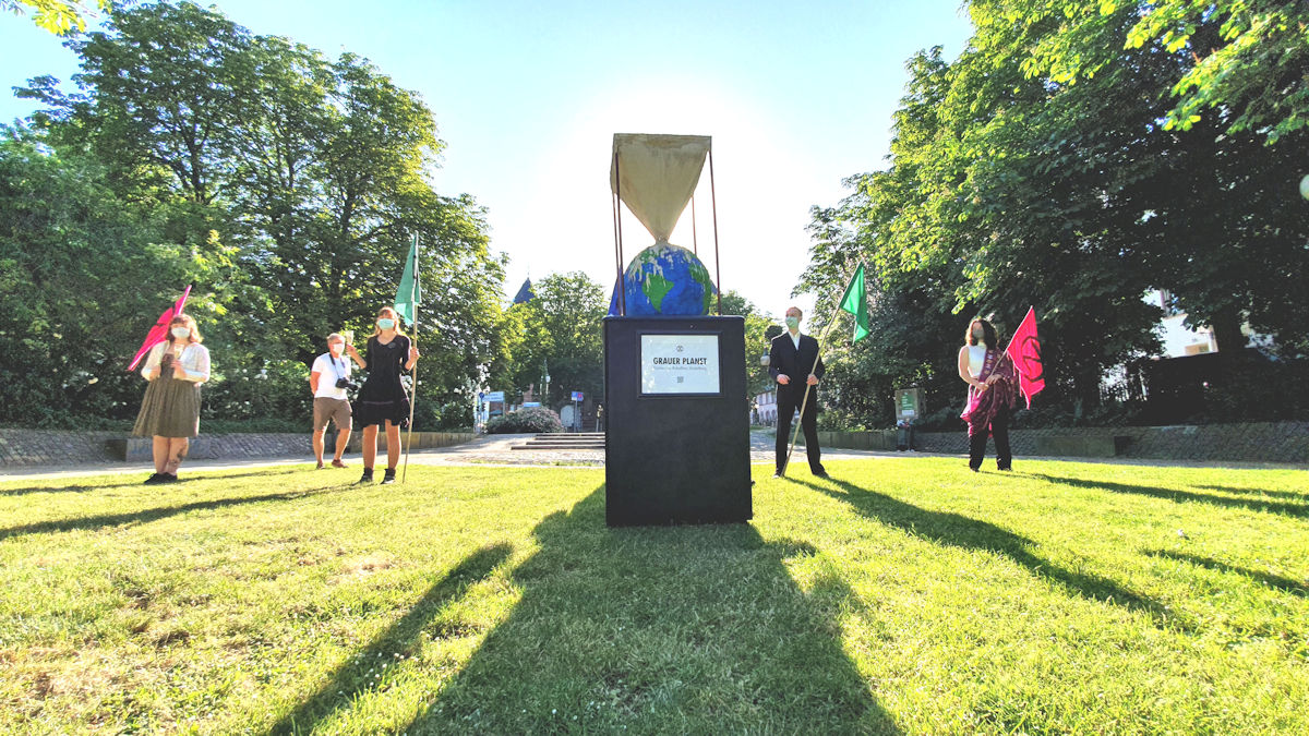 3.6.2020   Am Dienstagmorgen, den 2. Juni, präsentierte Extinction Rebellion Heidelberg auf dem Heidelberger Jubiläumsplatz ein Mahnmal gegen die Verbrechen von HeidelbergCement.  Als Abschluss einer mehrtägigen Kampagne gegen den Konzern wurde die illegal aufgestellte Statue “Der graue Planet” in einer Kunstperformance enthüllt,