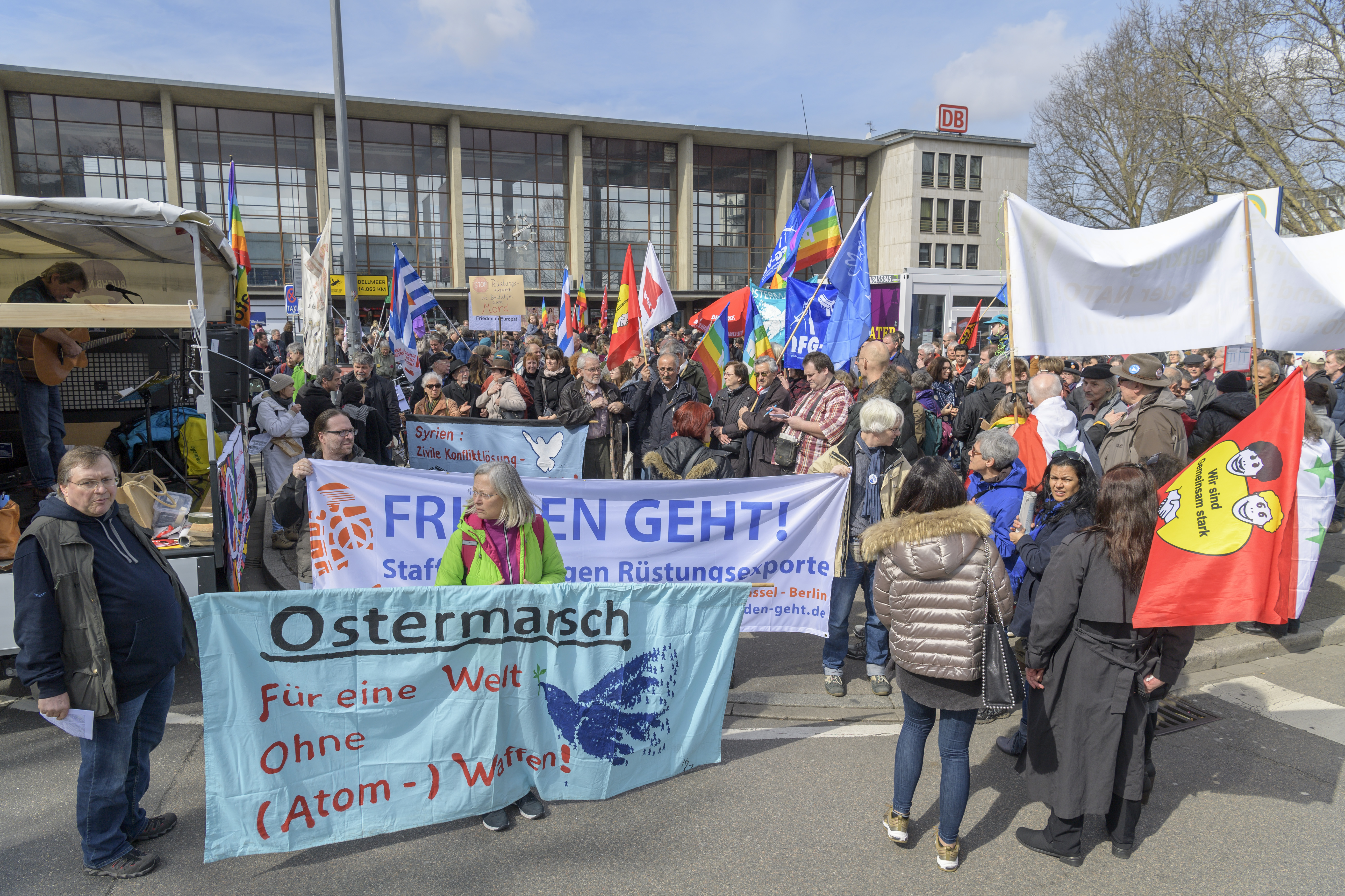 3.4.2018 awl   Bei blendendem Osterwetter nahmen rund 500 Heidelberger und Mannheimer am diesjährigen Ostermarsch teil. Bei der Auftaktkundgebung vom Hauptbahhof, nach der Ankunft der Mannheimer Teilnehmer, fand eine Kundgebung statt mit Redebeiträgen zu Aufrüstung und Steigerung des Militäretats (Thomas Wenzel,DGB), zu Kriegen als Fluchtursachen (Joachim Guilliard, Antikriegsforum)