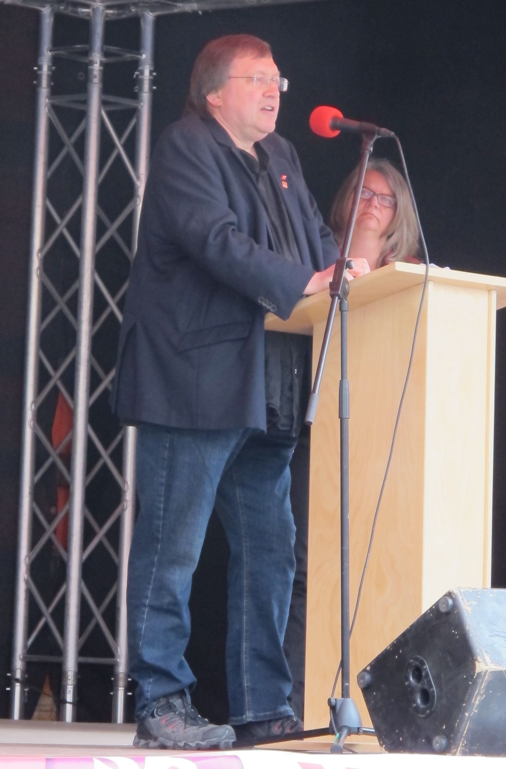 1.5.2018  awl   Ein bunter Zug aus Gewerkschaftern und Sympathisanten, von Parteimitgliedern der SPD und der Linken, folgte dem Aufruf des Deutschen Gewerkschaftsbundes, den 1. Mai zum „Kampftag der Arbeitnehmer“ zu machen, wie der DGB Kreisvorsitzende Thomas Wenzel es formulierte. Gerade auch in der Region sei es wichtig, sich gegen den Abbau von Arbeits- und Ausbildungsplätzen zu wehren, die nicht nur private Unternehmen wie ABB, Siemens, Heidelberger Druckmaschinen, sondern auch das Universitätsklinikum Mannheim betrieben.